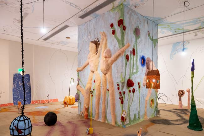 Una fuerza metabólica gobierna el crecimiento de su obra, donde conviven pinturas, dibujos y esculturas tanto diminutas como colosales, tan laboriosas como elementales. En ellas, la artista combina técnicas y procedimientos de la producción textil artesanal como el patchwork, el collage con elementos recolectados y, más recientemente, el yeso y el pastel tiza, que aportan una nueva fluidez a las imágenes. Sus composiciones están pobladas de figuras blandas, fragmentos de cuerpos en transformación, flores y frutas de la mejor tradición del bodegón, así como referencias entretejidas de los movimientos artísticos del siglo XX y de diversas capas de la historia de la cultura, incluidas la antigüedad grecorromana, el cristianismo primitivo y el hippismo de los años sesenta.
