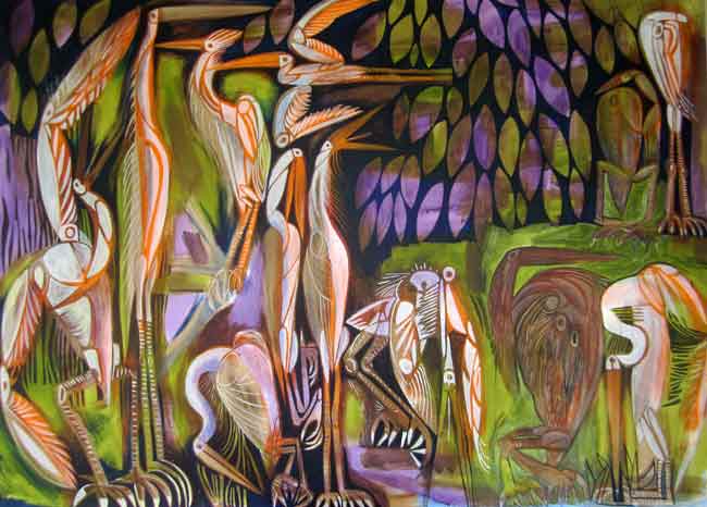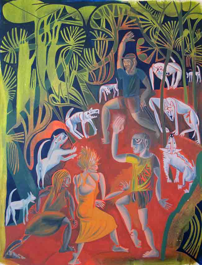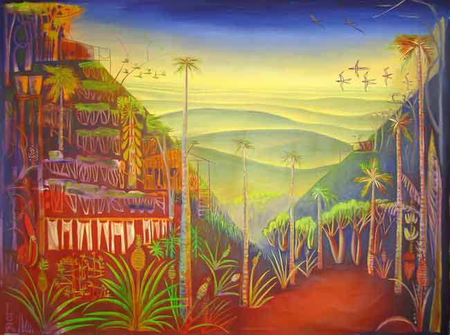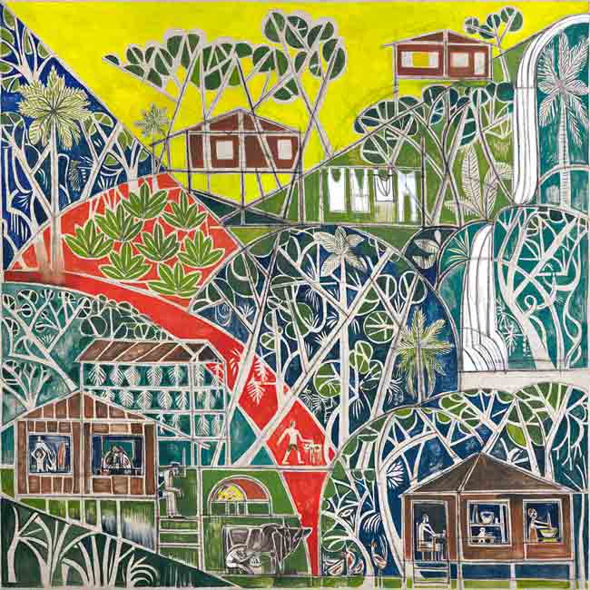 Anclada en la tradición del paisaje y del retrato, bajo el dominio de una “urgencia de registro”, en palabras de la artista, y con el color como disparador, su pintura nos enfrenta a imágenes que traen reminiscencias del arte popular e ingenuo, a la práctica del grabado, y a algunos códigos formales del arte prehispánico, y que pretenden dar cabida a cada uno de los ingredientes del tiempo y espacio transitado. El resultado es una producción independiente y profundamente poética, atenta a los accidentes y eventos que ofrece y se suceden en el territorio. Desde este repertorio de imágenes, que a primera vista parecen fantasía pero cuya representación está anclada en una intensa búsqueda por dar cuenta de lo visto, la artista invita a repensar la cotidianidad como una sucesión de acontecimientos deslumbrantes, aunque no libre de tensiones.