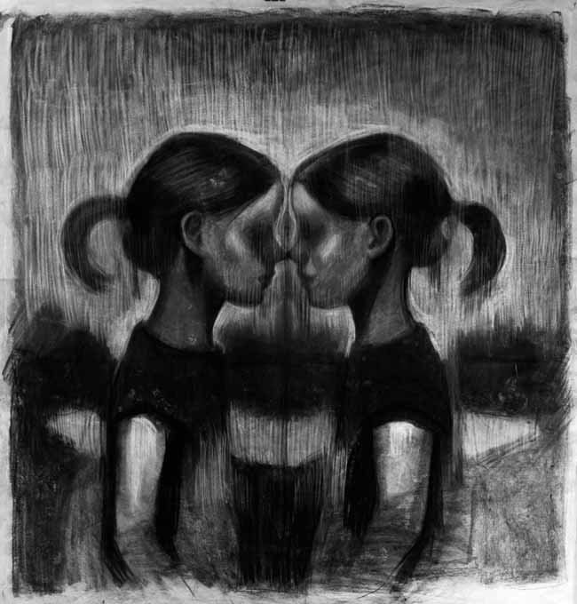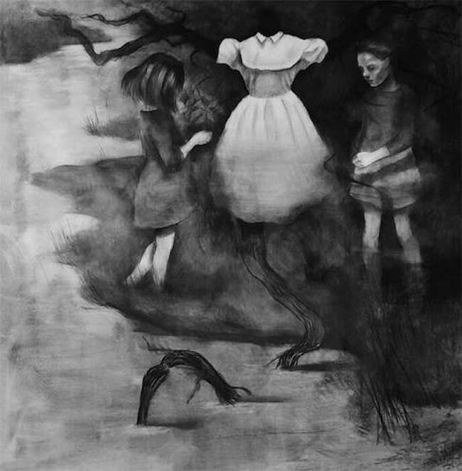 Los dibujos de Josefina Madariaga plasman una atmósfera sombría muy particular que surge de la precisa combinación de dos elementos: por un lado, unas narrativas densas, a medio camino entre lo fantástico, lo familiar y lo siniestro; por otro, un material como la carbonilla, que se manifiesta en negros intensos, trazos gruesos y manchas oscuras. A estos trabajos se suman otros tridimensionales, que no abandonan el carácter lúgubre de este universo visual, aunque lo traducen a un cromatismo distinto.