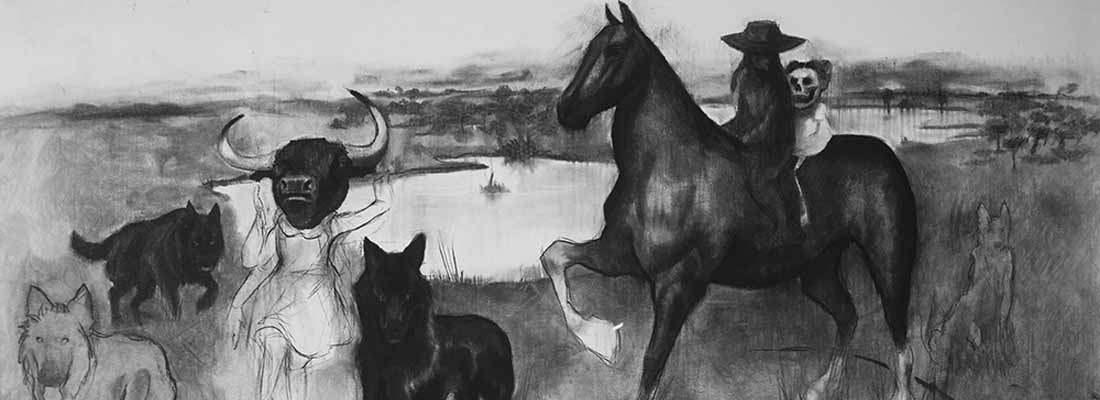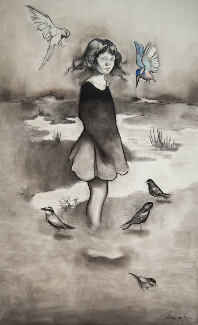 Madariaga recurre a una figuración potente para dar vida a su singular imaginario poblado por niñas de cabellos largos, muñecas, máscaras y animales, ambientado en los paisajes de su Corrientes natal. Este imaginario bebe en los mitos populares, las leyendas rurales y las historias ancestrales con las cuales la artista convivió en su niñez. Aquí se despliegan imágenes y alucinaciones que la obsesionan: la infancia, la inocencia perdida, la soledad, una feminidad en diálogo con el salvajismo y la violencia, la vitalidad de lo inanimado, las dualidades perturbadoras. Todo aunado mediante unos trazos decididos pero sugerentes, que abren el juego a posibles incertidumbres del espectador.
