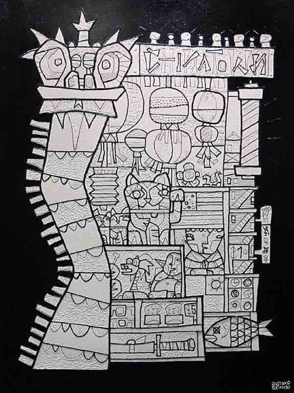 Gustavo Reinoso es poseedor de una imagen que lo identifica y crea atmósferas con admirable composición del espacio pictórico, cerca del grafismo y del color .
